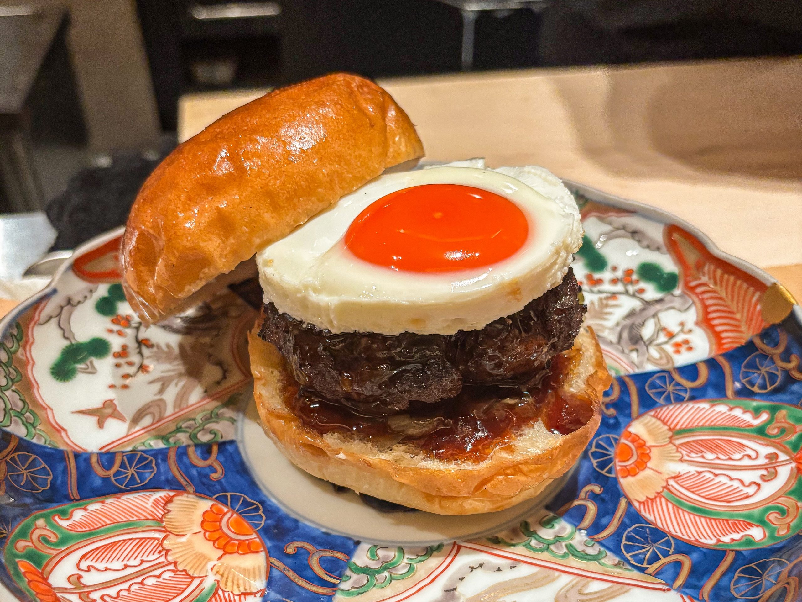 ハンバーガーなので、気軽でカジュアルな印象を持っていましたが、ここ「atami」はまったく違います。席はわずか8席、薪の炎で丁寧に焼き上げる和牛のパティ、静かな空間に流れる緊張感と期待感。料理が出てくるたびに、目と心を奪われました。